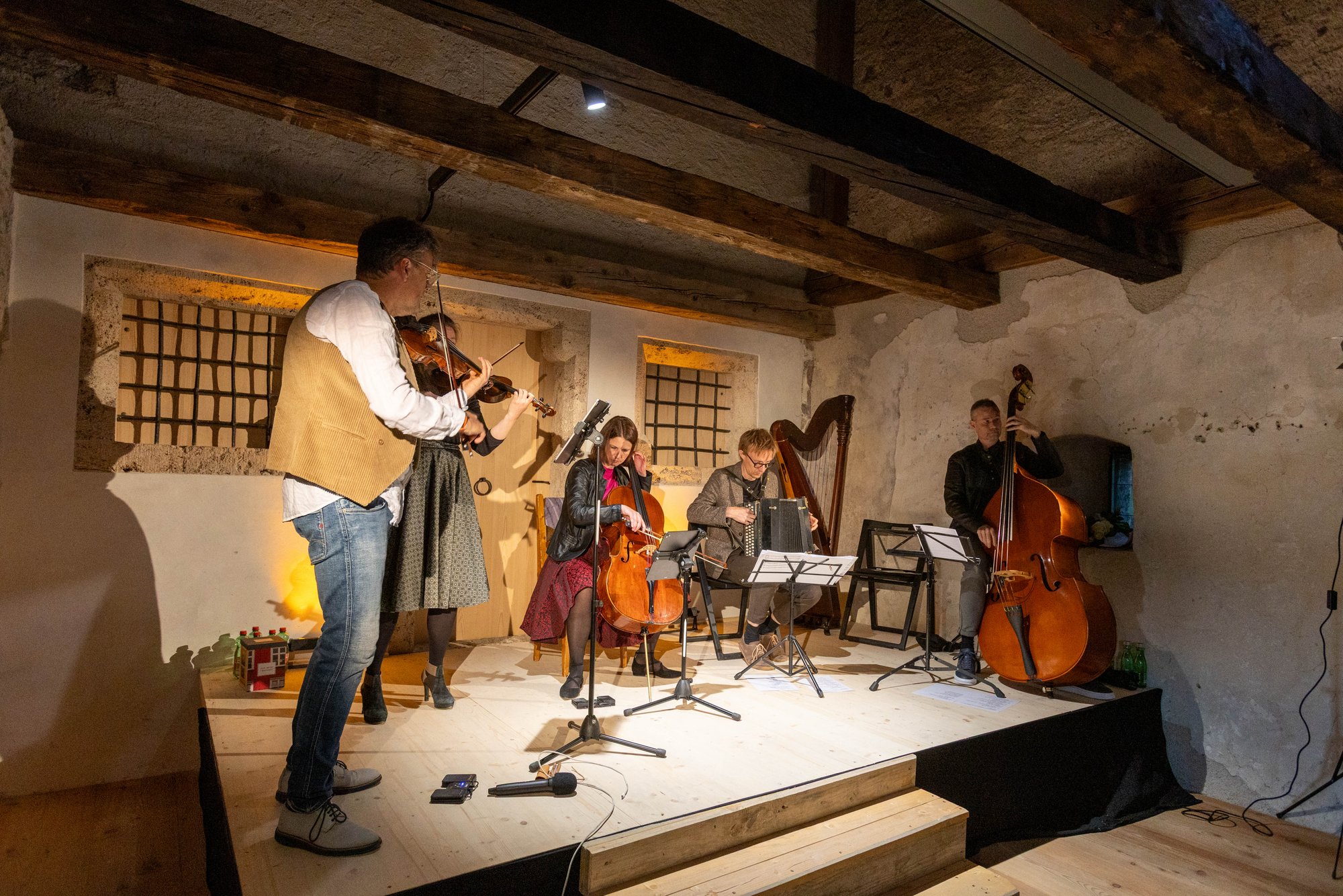 Anstelle von Günther Hopfgartner war Andreas Teufel mit einer Schrammelharmonika auf der Bühne – ein Instrument, das dem Ensembleklang eine besondere Färbung verlieh. Gemeinsam mit Erich Feichter (Violine, Gesang), Anna Feichter (Violine, Gesang), Ulli Mattle (Cello, Harfe, Gesang) und Peter Paul Hofmann (Kontrabass) ergab sich ein abwechslungsreiches Klangbild, das bewusst mit Gegensätzen spielte.
